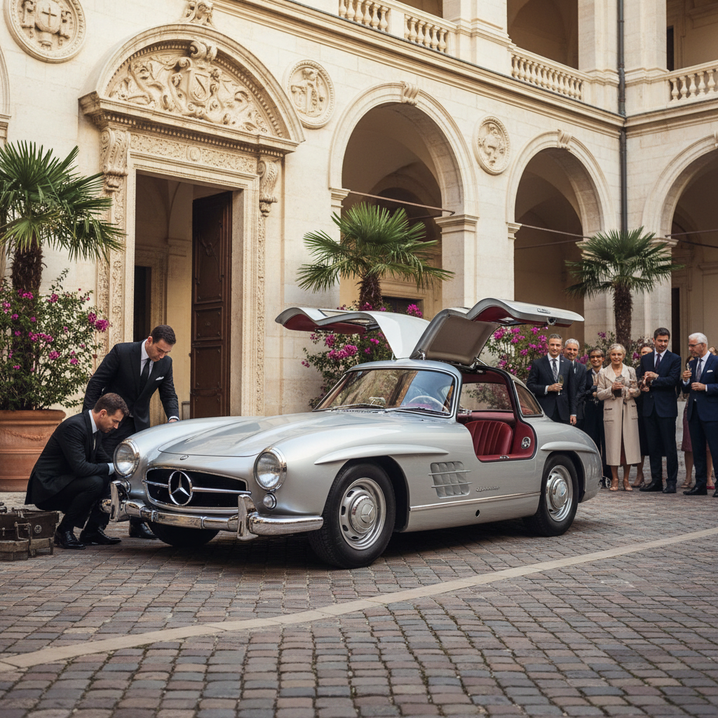 Istoricul acestui 300 SL Gullwing este la fel de impresionant ca și designul său. Livrat oficial la începutul lunii aprilie 1956, automobilul a fost reținut inițial de fabrică pentru uz promoțional, fiind prezentat de Mercedes-Benz la Salonul Internațional Auto de la Torino din 1956. Ulterior, a fost vândut lui Agostino Di Stefano, care a înregistrat mașina la Milano în mai 1956 și intenționa să participe cu ea la faimoasa cursă Mille Miglia din 1957, purtând numărul de concurs „424”. Deși mașina nu a mai ajuns la startul cursei, intenția de participare adaugă o notă de exclusivitate poveștii sale.